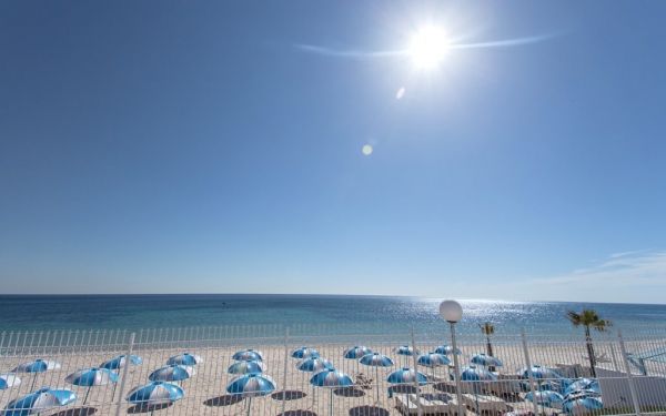 Собствен, пясъчен. Чадърите и шезлонгите на плажа и басейна - безплатно, матраци - срещу заплащане. Плажни кърпи не се предлагат.