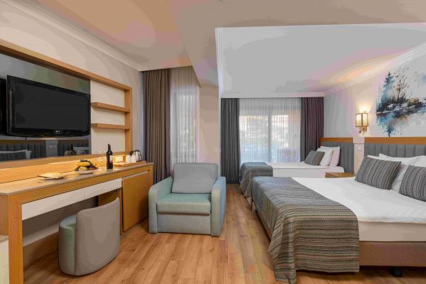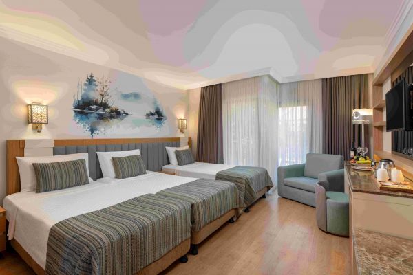 Стаи Arycanda: 246 Standard room sea/pool side (изглед море/басейн - 28 м2), 7 Junior Suits (1 спалня, 1 диван, 1 баня - 35 м2).