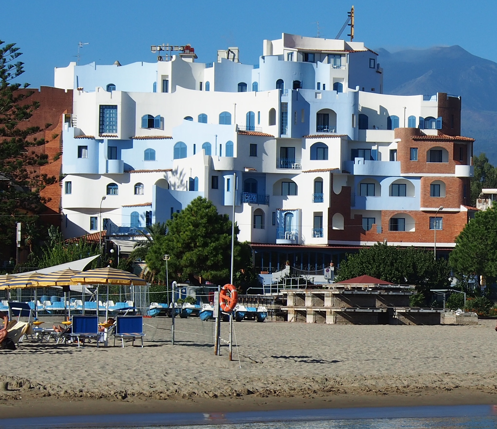 Точно срещу хотела се намира пясъчният плаж на прекрасния курорт Джардини Наксос със свободна и платена зона. Ползване на един чадър и два шезлонга – 15 евро (цена към м. март, 2017). Плажът е пясъчен и просторен и с полегато дъно. Подходящ е за деца.
