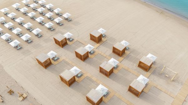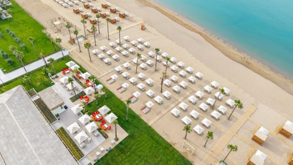 Собствен, пясъчно-чакълест. Чадъри, шезлонги и плажни кърпи на плажа и при басейна - безплатно.