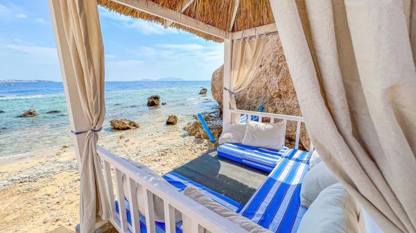 Собствен, пясъчен и коралов, с дължина 700 метра, кей. Чадъри, шезлонги и плажни кърпи на плажа и при басейна – безплатно.